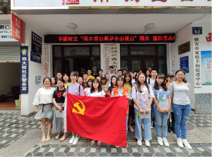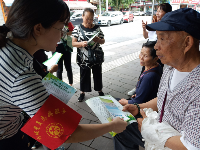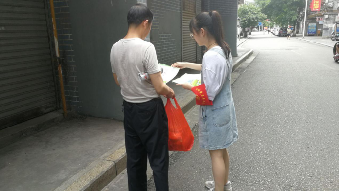 6月18日,学院党支部志愿者和西大街社区工作人员一起挨家走访住户进行环保宣传活动,倡导市民做好环保工作。