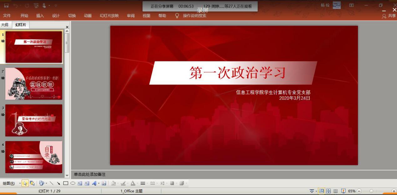 2020年3月24日星期二下午4:20,由于疫情原因必赢565net官网计算机党支部在线上组织了以“学习新时代雷锋精神——向奋战在疫情防控一线的雷锋致敬”为主题的政治学习分享会,此次分享会由杨检同志主持召开。支部预备党员积极参与,学习气氛浓厚。