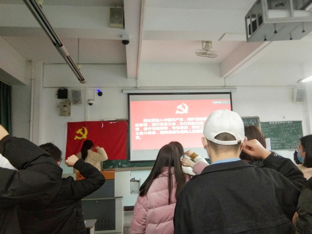 会议伊始,由吴俣昊同志介绍本次大会的主要内容并宣布会议开始。根据大会议程,会议首先由发展对象依次宣读入党志愿,汇报自己对党的认识,陈述入党动机及自身表现,主要优缺点及需向党组织说明的有关问题。随后由培养联系人根据发展对象的了解,分别总结各位发展对象的表现,说明对申请人的介绍理由和考察情况,表明了自己的意见。最后经支部党员充分讨论,以正式党员无记名投票方式对发展对象进行投票并现场逐一公布投票结果,一致同意接收周洋等7名同志为中共预备党员。会议宣布后,预备党员同志们面对党旗进行庄严宣誓,何晴茜同志作为预备党员代表发言,向大会表达了自身的想法与决心,不忘初心跟党走,在今后的学习工作中,坚定目标、严格要求自身,争取早日正式加入中国共产党。