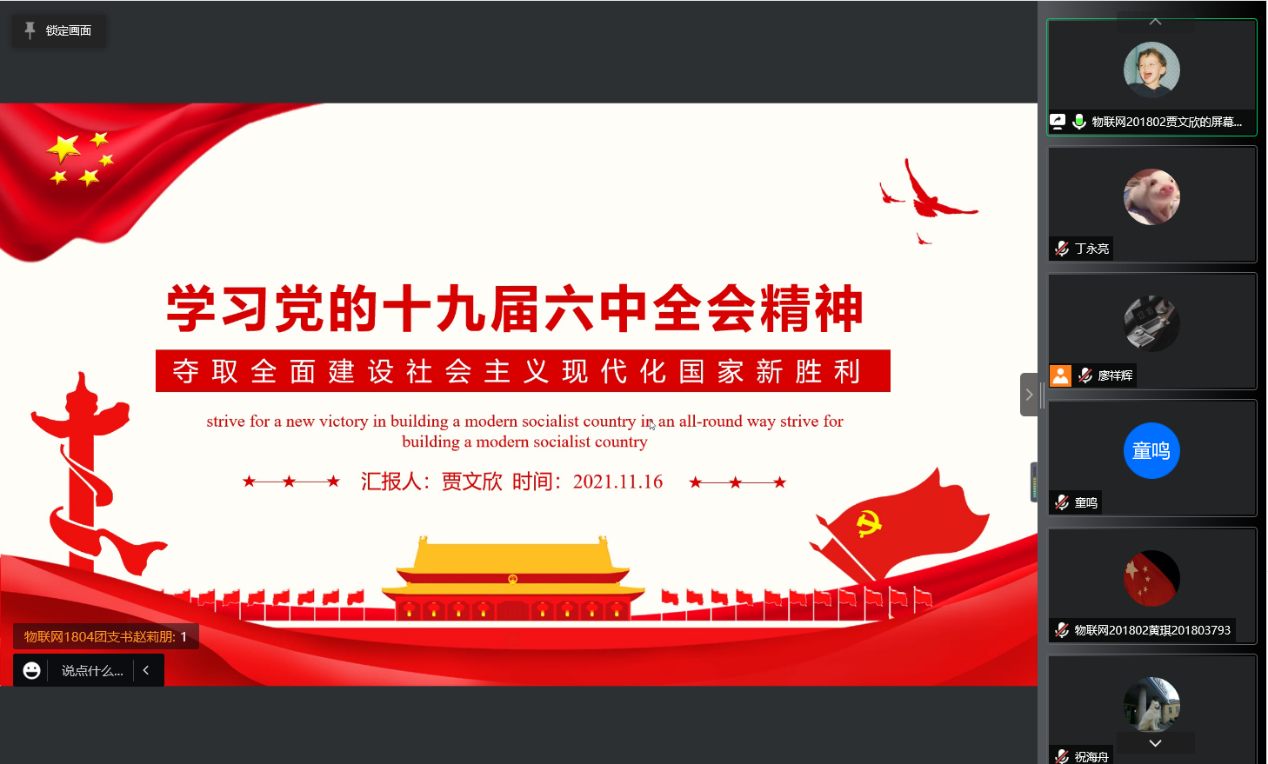 11月16日下午四点半,必赢565net官网物联网学生党支部在线上开展了以“十九届六中全会”为主题的学习会,支部全体党员同志参与学习。