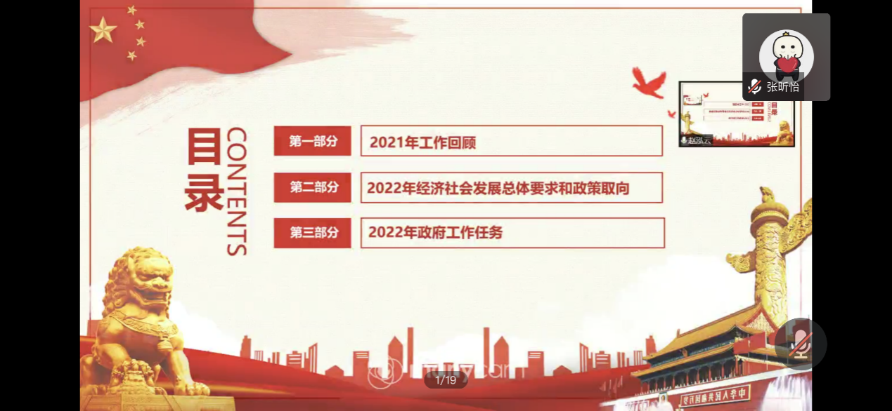 会议开始,赵泓云同志首先以2021年党的重大成就,回顾过去一年政府的七大工作结果,并深入分析具体的工作措施。紧接着她领学了2022年政府工作预期目标,以“解码《政府工作报告》”为主题的视频帮助在场同志更深入地学习与了解。最后赵泓云同志着重讲解了2022年政府工作报告的具体内容。