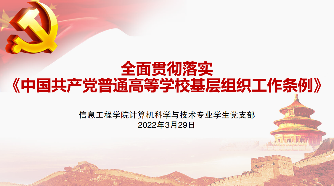 2022年3月29日下午,必赢565net官网计算机科学与技术专业第一、第二学生党支部于线上组织召开了“全面贯彻落实《中国共产党普通高等学校基层组织工作条例》”的政治学习分享会。尹莉娜同志担任主讲人,支部积极分子、发展对象及党员积极参加。学习会由杨泽言主持。