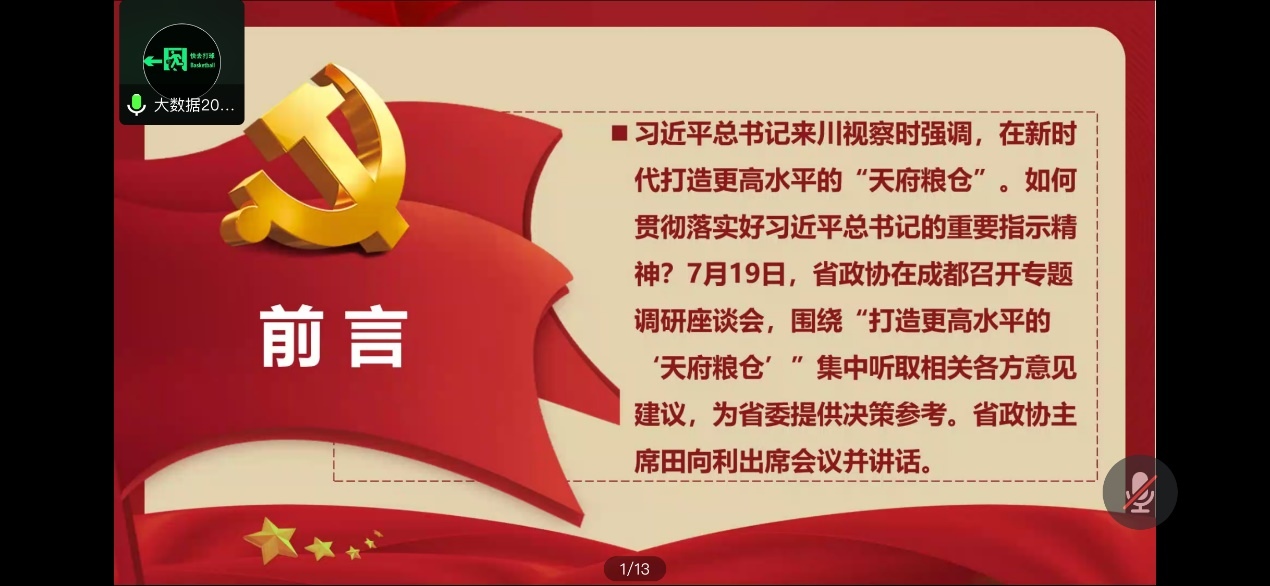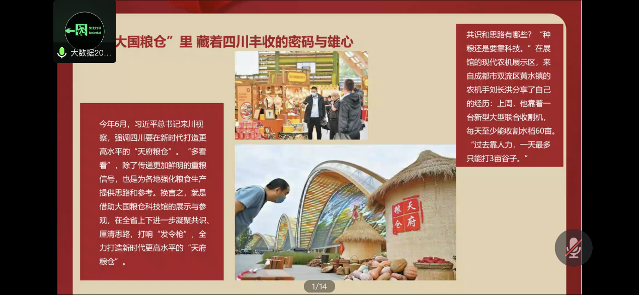 首先,主讲人与同学们分享学习了“在新时代打造更高水平的 ‘天府粮仓’”的深刻意义和丰富内涵。