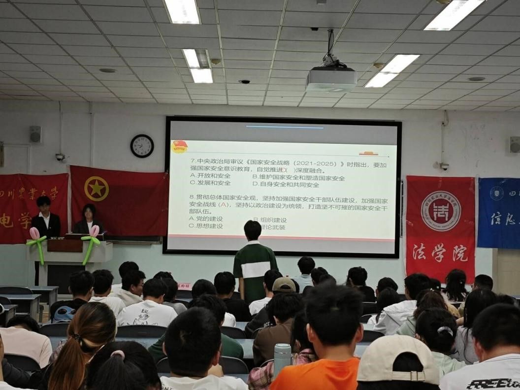 紧接着,活动迎来了国家安全知识讲解与竞答环节。校青马班优秀学员和志愿者们为在座同学带来了题为《国家安全有我,青春挺膺担当》的精彩宣讲。他们用生动的案例,深入浅出地解读了国家安全的重要性以及每个青年所肩负的责任。在知识竞答环节中,同学们积极参与,争相抢答,进一步加深了对国家安全知识的理解,更巩固了学习成果。