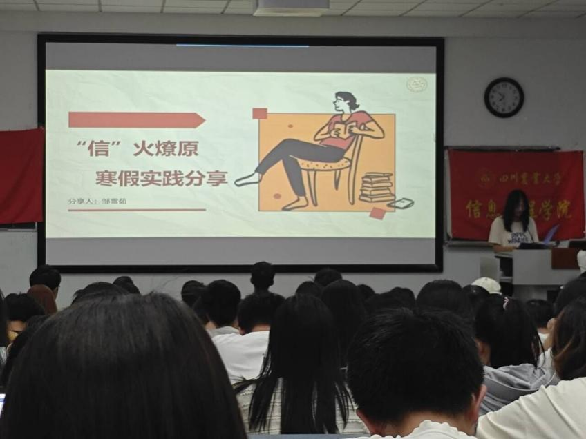 在“实践激扬青春志,挺膺担当建新功”社会实践分享中,“信”火燎原实践团负责人邹雪茹为同学们展示了社会实践十佳团队宣讲和社会服务成果。实践内容涵盖暖心服务社区、助力乡村振兴、寻访红色足迹、基层实地调研、智慧农业创新等。致力于以青年的视角和声音,深入学习并广泛宣传党的二十大精神,确保学习贯彻工作走深走实。