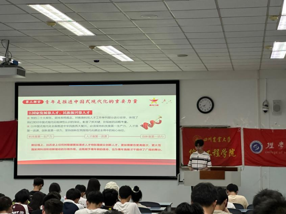 校青马班学员李骏威为同学们带来“学深悟透五四寄语,奋力书写青春篇章”主题微团课分享,带领同学们学习五四寄语精神,号召同学们坚定不移听党话、矢志不渝跟党走,书写五四精神的崭新时代篇章。通过观看校团委原创五四主题MV《青春的誓言》,共同唱响青春之歌,激发青春活力,引导青年学生秉承红色精神的伟大力量,传承红色基因、争做时代新人。