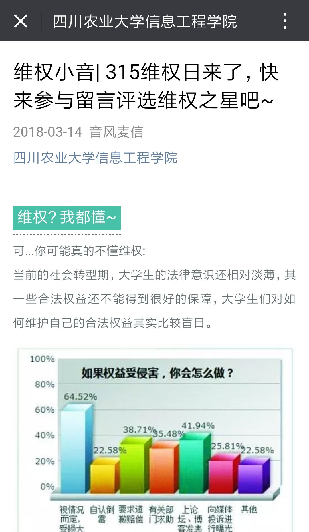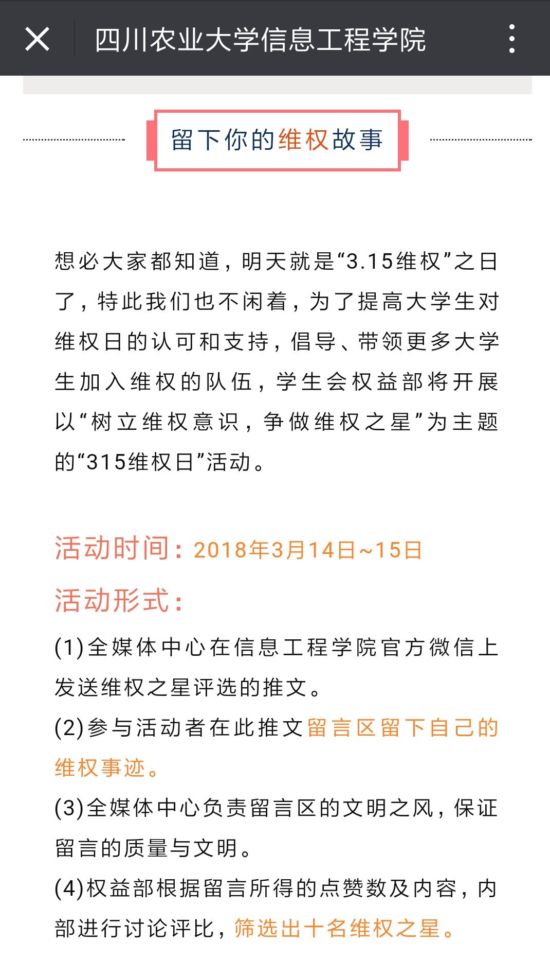 本次活动借助新媒体平台,在微信上宣传维权相关知识,鼓励大家在留言区讲出自己的维权故事。14日晚,全媒体中心在微信平台推出相关文章,立即引起了广大师生的关注。大家在留言区侃侃而谈,迫切希望将自己在维权道路上的艰辛一吐为快。化妆品造假、水果摊缺斤少两、校园惊现天价理发店,这些损害消费者利益的事件被一一列出。面对这样的事情,大多数同学选择忍气吞声,但也有同学据理力争,并最终维护了自己的合法利益。15日晚上24点,学院根据留言互动的具体情况,评出了十位“维权之星”,并为他们准备了证书以及精美的小礼品,对他们的维权行为表示认可,希望他们能将这种精神保持下去,并感染身边的同学,让星星之火,得以燎原。