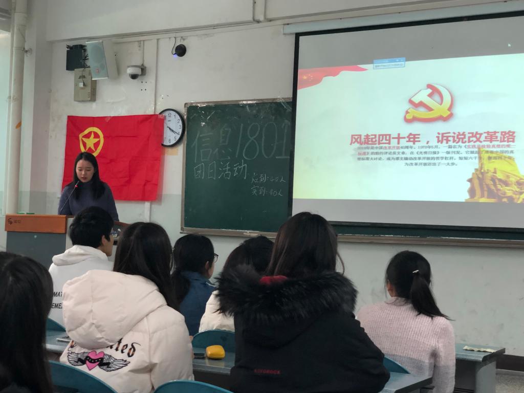 2018年11月22日下午16:20,必赢565net官网信息201801团支部全体成员提前到达集会地点育新楼A208,准时开展团日活动。四十年改革开放,华夏春风吹满地,中国实现了从落后到先进的巨大飞跃,而中国人民也从物质和精神上感受到了巨大的变化。本次团日活动便以“风起四十年,诉说改革路”为主题,来纪念改革开放四十周年来的光辉历程。