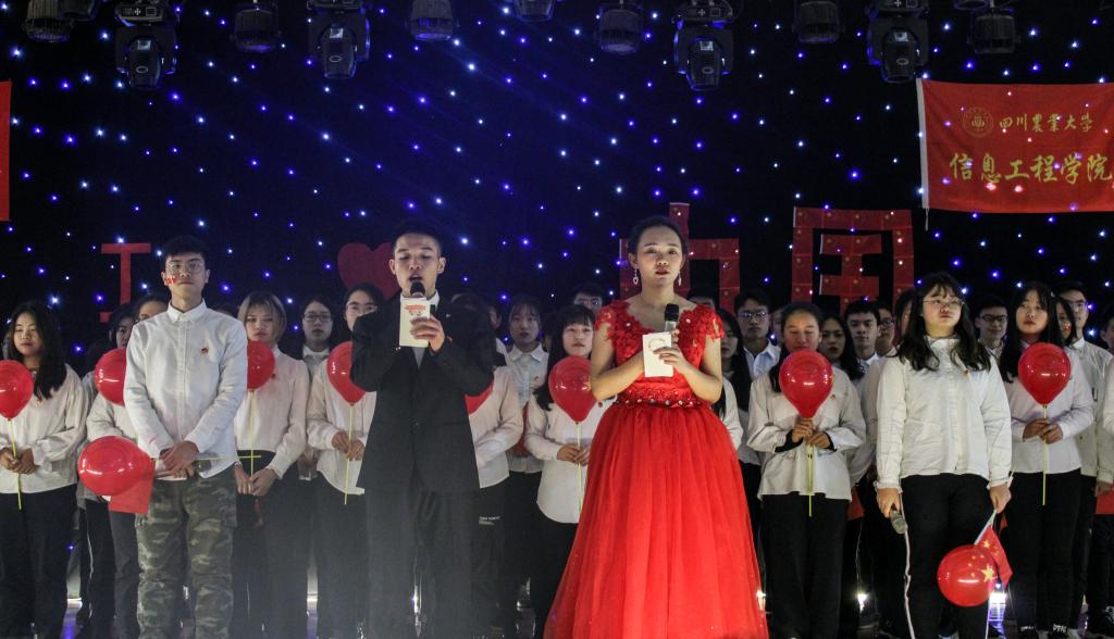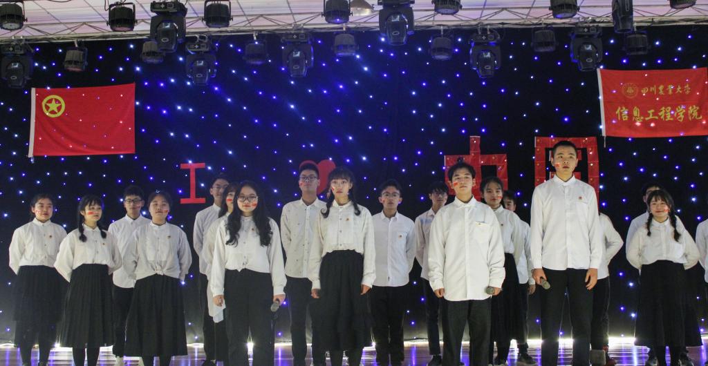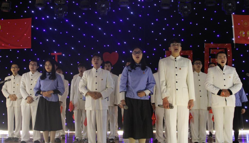 本次示范性团组织生活以晚会的形式开展。开场前,在舞台的左下方播放着一则名为《表白祖国,做最美主角》的视频,视频中播放的是信工学子诉说自己对祖国的美好祝福。一则新闻播报讲述了新中国成立70周年走过的峥嵘岁月,将观众的视线拉到晚会现场。在全场同学面对团旗高唱的团歌声中,晚会序幕徐徐拉开。