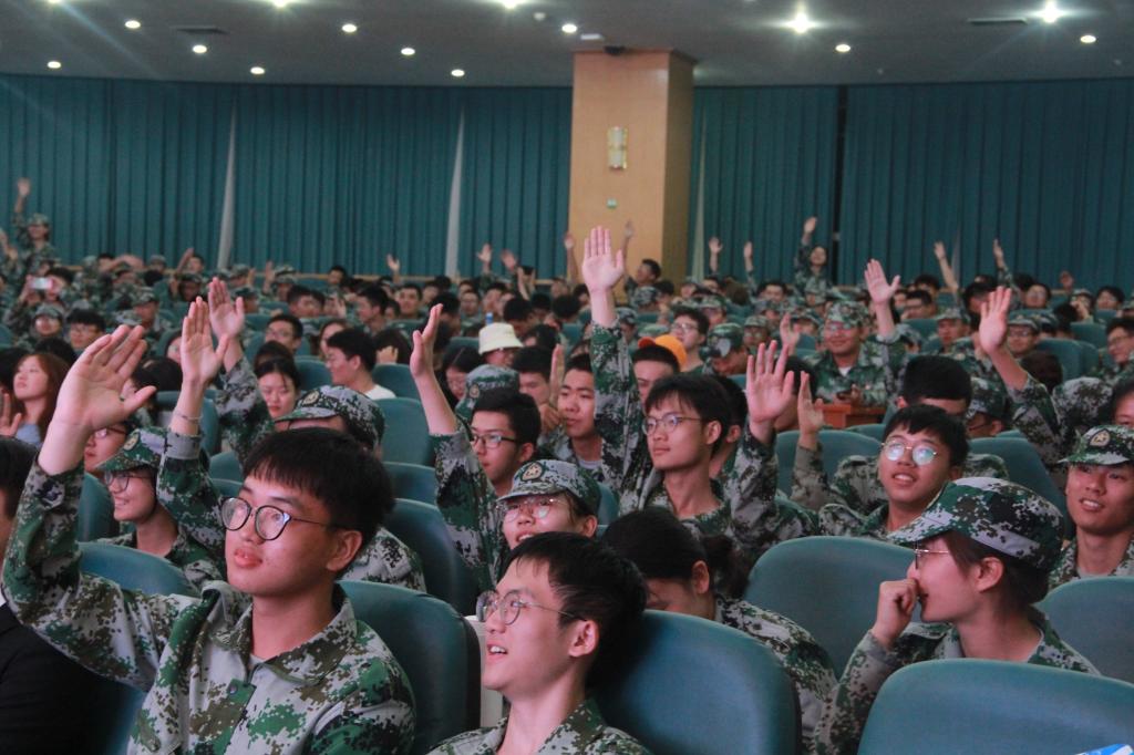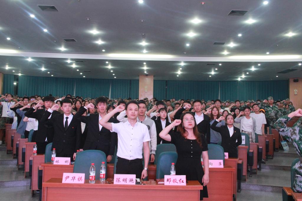 在“强国有我”研习环节,林彬和李慧敏同学分别带来“科技强国”和“教育强国”主题社会实践分享。林彬以自己运用计算机技术研究鱼病的科研项目获得多项竞赛大奖的经历,勉励全体新生学好专业技术知识,为实现科技强国贡献力量;李慧敏则生动有趣地讲述了自己下乡支教的故事,一则记载支教掠影的短视频收获现场掌声不断,一个个有趣的场景、一张张开心的笑脸让同学们感同身受。新生陈泓锟同学带领全体师生进行“强国有我”宣誓,铿锵有力的宣誓声将活动带入高潮,传达出青年人要为实现中国梦而贡献青春力量的坚定信念。