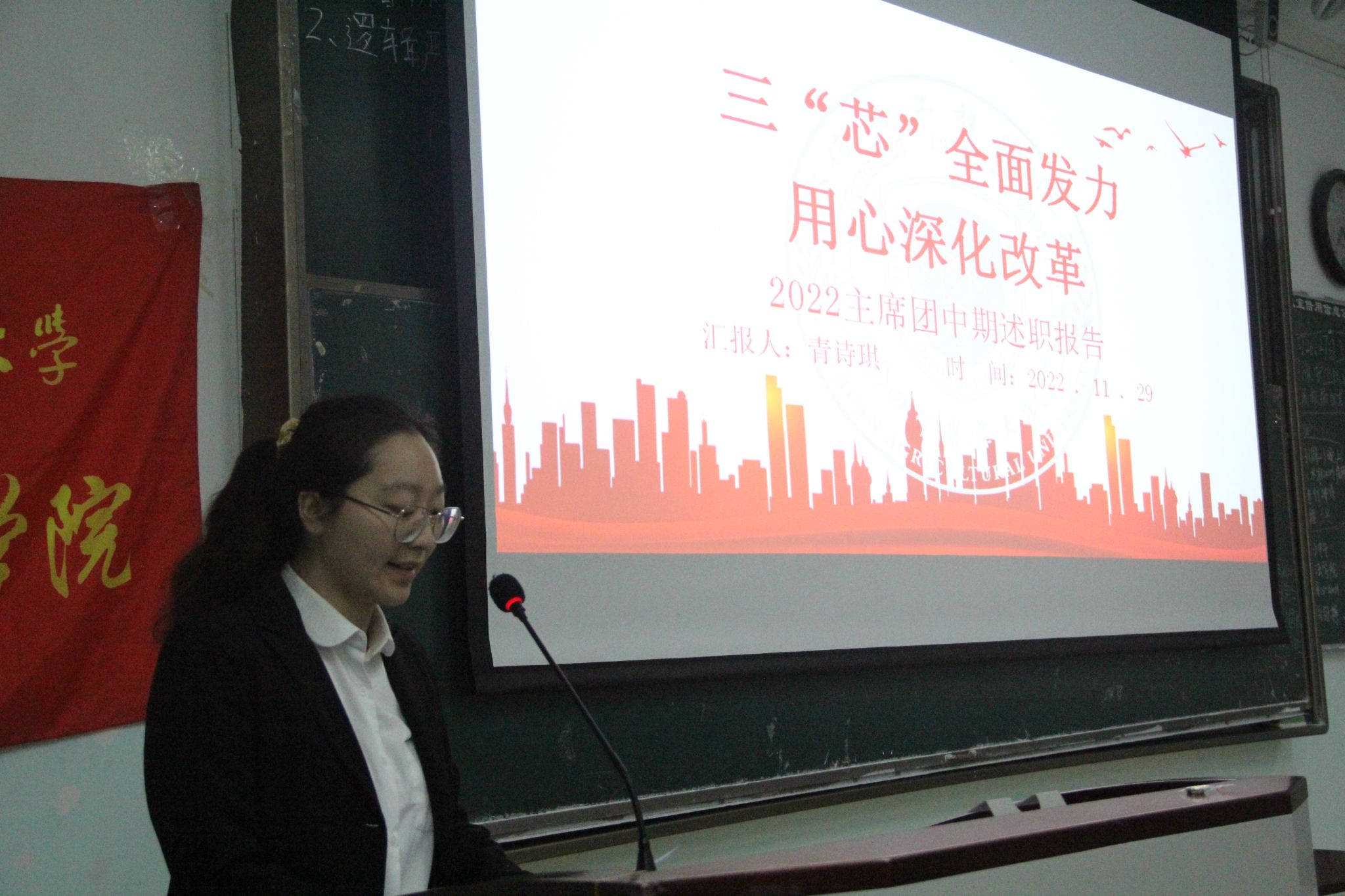 为加强团委学生会建设,提高工作质量,展现我院学生组织的风采,更好开展后续学生工作,必赢565net官网于11月29日下午在十教A401开展必赢565net官网第九届团委学生会中期述职答辩会。学院党委办公室主任邓秋红老师、学院党委办公室副主任曹小娇老师、党委办公室阿迪力江老师、向建桦老师、主席团成员、各部门主干以及代表线下参会。答辩会由主席团成员赵显梦主持。