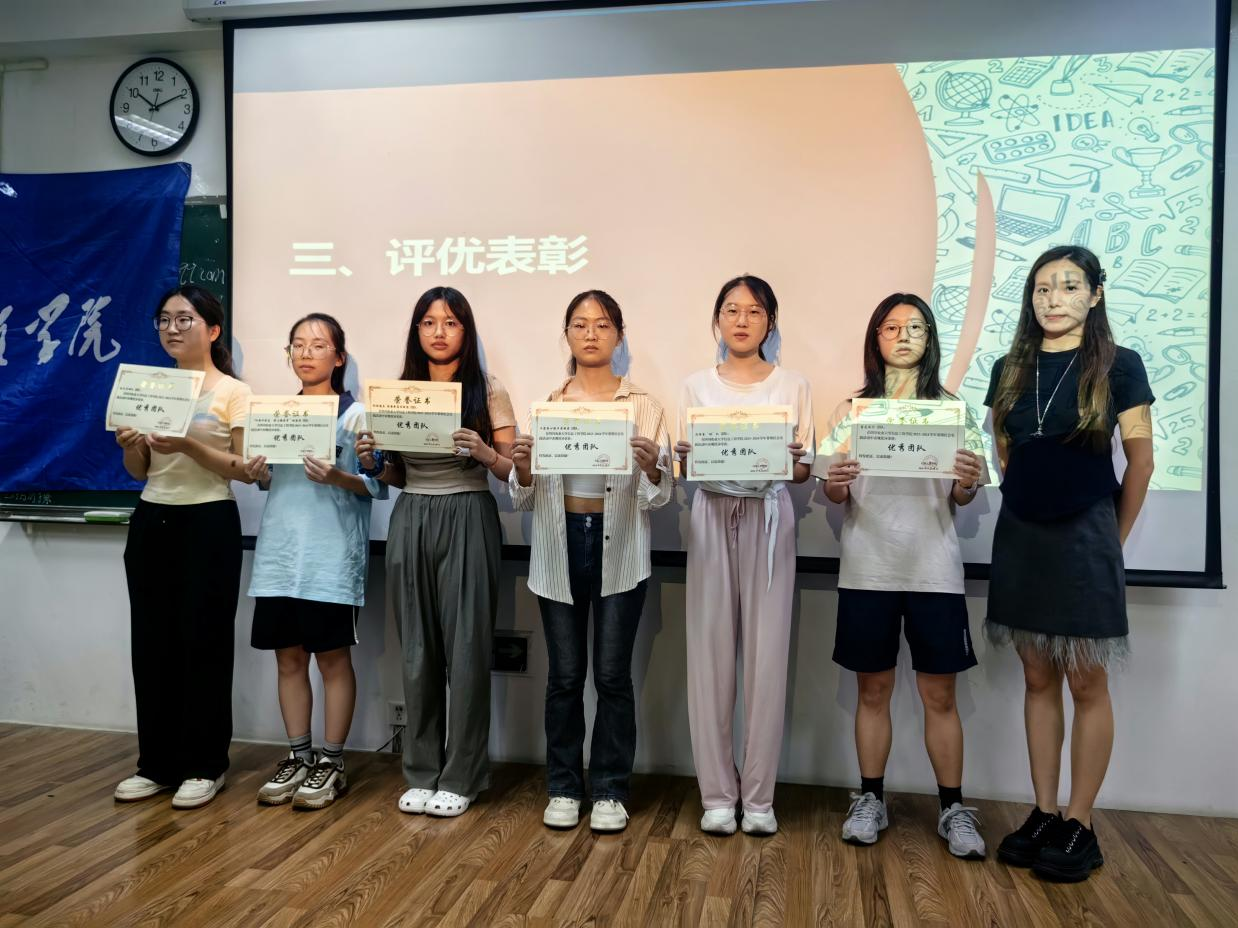 为表彰先进,激励更多优秀团队和个人在社会实践中受教育、长才干、做贡献,杨纯婧代表院团委为荣获暑期社会实践院级优秀团队和优秀组织委员颁发了荣誉证书并合影留念
