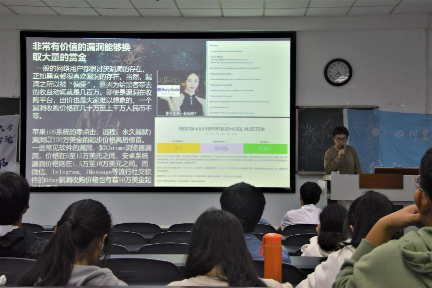 次日,来自Iot全栈工作室的龚嘉毅和赵佳玺同学就前端开发和后端开发为同学们展开详细的介绍,通过展示工作室现有的上线项目,让同学们更加深入了解其工作室。接下来SEC网络安全工作室的符芳荣同学通过一个引人入胜的兴趣案例,分别从独特的受害者和攻击者视角形象生动地讲述日常生活中常见的网络安全问题。最后首先由WingStudio工作室的主讲人赵刘学同学介绍了其工作室的主要情况,紧接着WingStudio工作室的李郢昱同学详细介绍了Web前端开发的用途和学习路线,同样是WingStudio工作室的刘聪同学带来新兴的Golang语言的介绍,随后WingStudio工作室的魏宇鑫同学为同学们介绍了深度学习的学习方法和路线规划。至此,宣讲会在现场同学们的欢呼声中进入了尾声。