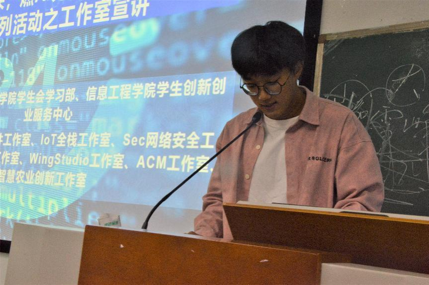 在10月24日的宣讲会中,首先由AIoT硬件工作室的宣讲人付鹏圣同学向同学们展示智能鸡舍系统、工业机器人、深度相机、智能炒茶机、智能老人看护机器、稻田智能灭虫灯等AIoT硬件工作室项目成果,拉开了宣讲会的帷幕,让同学们切实感受到嵌入式人工智能为生活带来的便利。随后来自今年刚成立的ACM工作室的李鑫同学围绕ACM工作室的特色,展开介绍精妙的算法和竞赛。紧接着智慧农业创新实验室的宣讲人陈泓锟同学介绍了如何利用大数据、云计算、人工智能和物联网技术等推动智慧农业领域的创新,带领同学们领略不一样的农业,将活动现场的氛围推向了高潮。最后来自ACU志和同盟工作室的周胜翔同学从前端开发的个人发展历程和工作室至今获得的成就两方面展开讲解,强调提高专业技术才是硬道理。