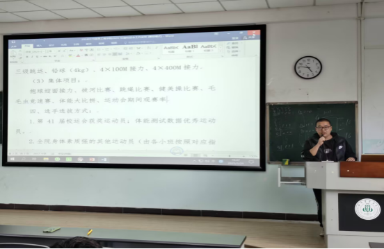 田尧夫要求各班文体委员全力配合相关学生部门的工作,并说道:“为更好地参与本次校运会,我们学院要全力以赴,班长和文体委员要发挥表率作用,积极动员班级同学参与各项体育赛事。这不仅能让同学们从紧张的学习中走出来,享受运动的乐趣,还能增强班级凝聚力,为学院争光,为个人添彩。”