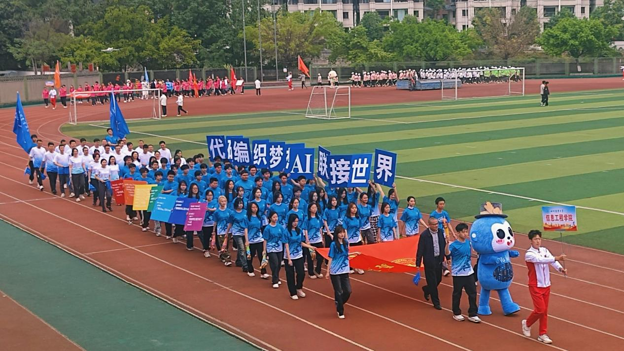 方阵入场,个性绽放。各个方阵依次进行入场展示,信工学院方阵身着特色服饰,高举“代码编制梦想,AI连接世界”的标语,黄绿色的标牌在阳光下熠熠闪光,以别样风采展现学院文化。同学们的脸上洋溢着青春的光彩,步伐中充满了自信与力量,彰显出新时代川农学子的蓬勃朝气与创新精神。
