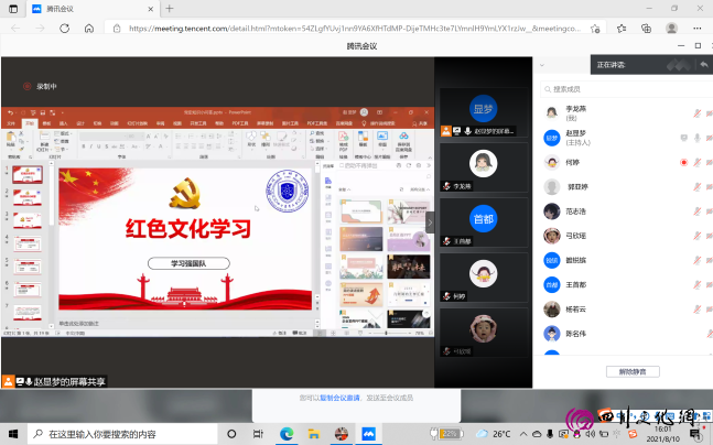 2021年8月10日下午4点,学习强国各成员举行了有关学习红色文化的线上会议。会议开始观看了建党百年电视剧《觉醒年代》;接着大家学习了“人民日报刊文:伟大抗美援朝精神,弥足珍贵的精神财富”以及“人民日报:红色文化与中国梦”;在会议的结尾,对队员们进行了党史知识问答,队员们都积极参与到答题当中。通过本次暑假实践活动,“学习强国”暑期社会实践队队员们感受颇深,表示会不忘初心、牢记使命,为中华民族伟大复兴的中国梦奋斗前行。(审:文毅)