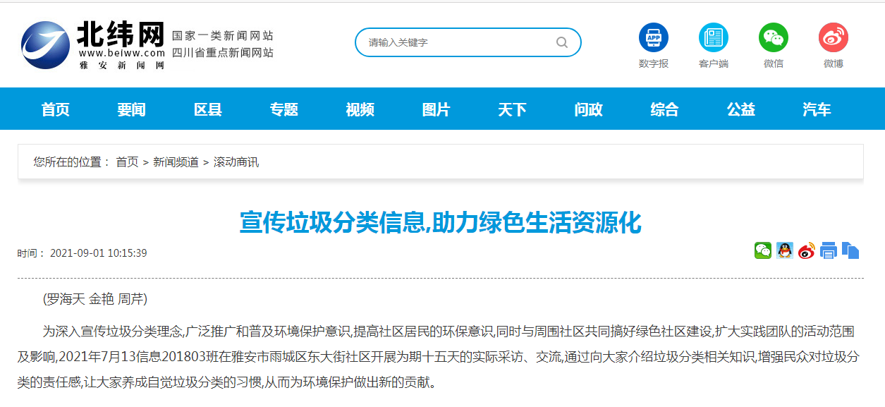 近年来,随着掀起的垃圾分类的热潮,人们逐渐对垃圾分类有了一定的了解,生活环境也有所改善,可是由于生活习惯等方面的问题,垃圾分类的实施效果仍然存在不少的问题。因此,为提升人民群众保护环境的意识,提高环境生存质量,2021年7月13日——2021年7月20日必赢565net官网信息201803班在雅安市雨城区东大街社区开展了以“倡导垃圾分类,保护生态环境”为主题的实践活动,通过向大家介绍垃圾分类相关知识,呼吁更多的人进行垃圾分类工作,增强对垃圾分类的责任感,让大家养成自觉垃圾分类的习惯,从而为环境保护做出新的贡献。