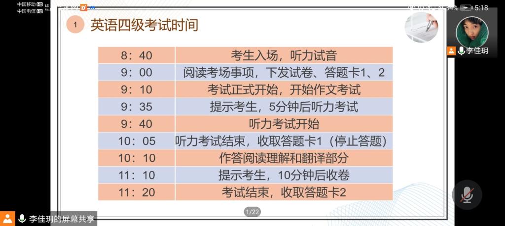 会议伊始,信工院的文蔡灿同学向大家分享了写作翻译的经验,建议同学们在写作时采用三段式结构,把握要点,注重平时写作素材的积累。同时,他围绕真题练习、常见考点等方面,层层剖析。在提问环节,同学们踊跃提问,说出自己的困惑,文蔡灿同学都耐心详细地进行解答。接着,艺传院的苏畅同学采用问答的方式向同学们介绍了在听力中预判问题、把握题眼、快速锁答等听力答题技巧,并在结尾以小彩蛋的形式强调刷题的重要性,引发了同学们的共鸣。最后,曹慧同学从考试题型的划分,以及阅读每个部分应该如何应用合适的做题技巧给同学们带来阅读经验分享,并在结尾向同学们推荐了一些备考的英语APP。分享结束后,主持人也对英语四、六级的考纲要求、试卷构成、考试流程及考生注意事项作了阐述,增强了同学们应对英语四、六级考试的信心。