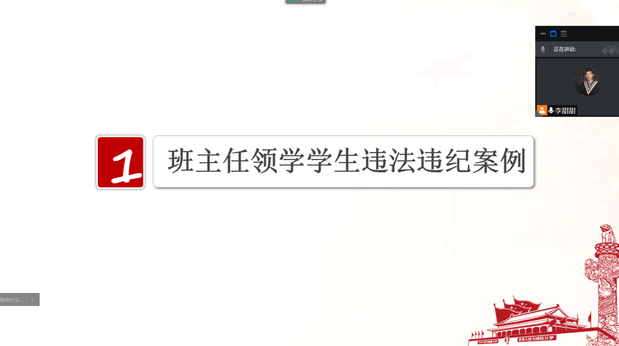12月7日下午,党委办公室陈明滟老师主持并召开线上会议,全院各小班班主任和班长支书参加会议,会议传达了主题班会的主要学习内容并强调了法纪教育的重要性。