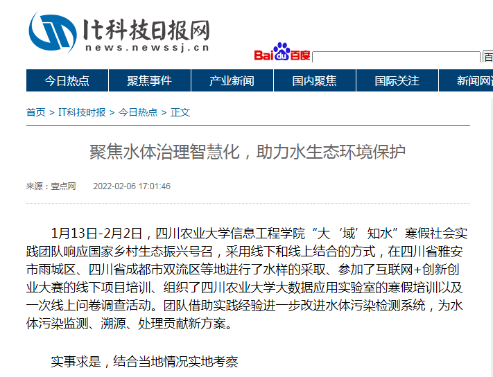 1月13日-2月2日,必赢565net官网“大‘域’知水”寒假社会实践团队响应国家乡村生态振兴号召,采用线下和线上结合的方式,在四川省雅安市雨城区、四川省成都市双流区等地进行了水样的采取、参加了互联网+创新创业大赛的线下项目培训、组织了必赢565net官网大数据应用实验室的寒假培训以及一次线上问卷调查活动。团队借助实践经验进一步改进水体污染检测系统,为水体污染监测、溯源、处理贡献新方案。
