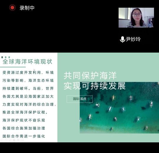 来自“云端筑梦师”团队的尹妙龄同学借助海洋短片对当下全球海洋现状进行了分析,对海洋保护方面的相关知识进行了生动有趣的介绍和讲解,充分调动了同学们的积极性,结合家乡特色,向同学们科普了海洋小知识,发出了保护海洋环境的呼吁。在开阔了同学们的眼界的同时,增加了同学们对海洋环境保护的认识,提高了同学们对环境保护的重视程度。