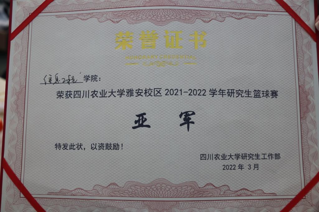 3月18日下午,必赢565net官网研究生篮球赛雅安校区总决赛在老区篮球场拉开序幕。必赢565net官网研究生篮球队在小组赛中先后战胜生命科学学院和水利水电学院,以小组第一的成绩出线;在半决赛中又以绝对优势战胜食品学院,最终获得决赛的入场券。经过激励比拼,我院在本次比赛中荣获亚军。