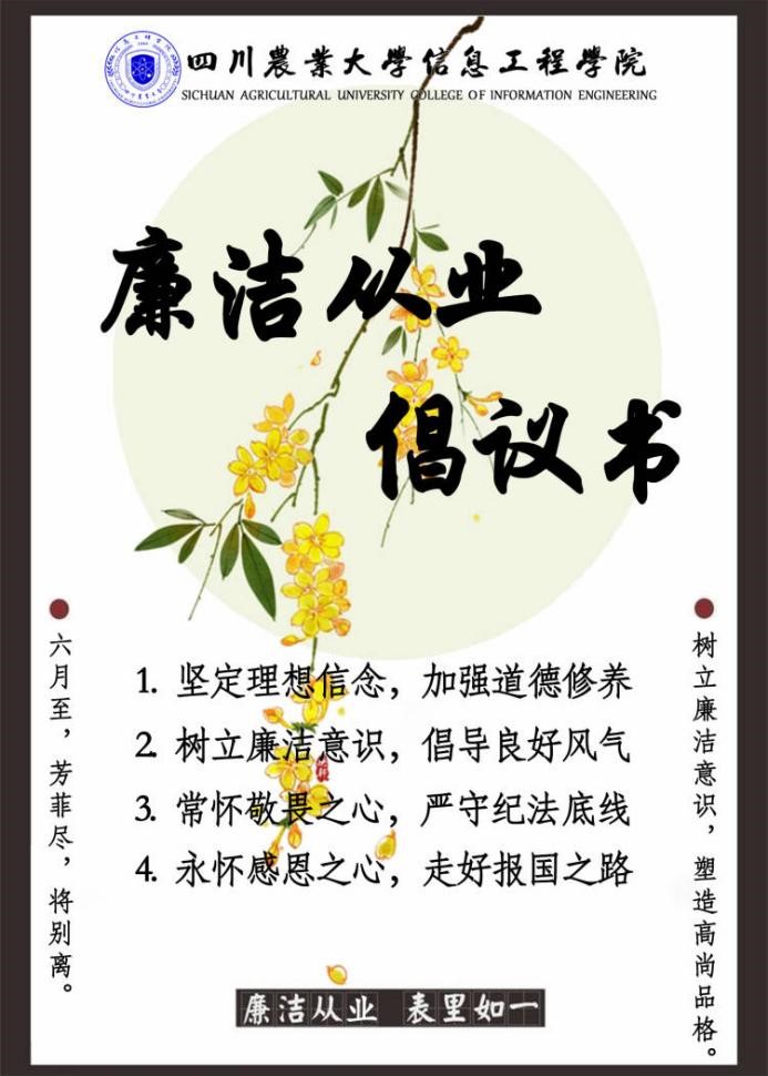 此外,学院还通过制作海报、发布推文的方式向全体毕业生发起廉洁从业倡议,倡导同学们:一要坚定理想信念,加强道德修养;二要树立廉洁意识,倡导良好风气;三要常怀敬畏之心,严守纪法底线;四要永怀感恩之心,走好报国之路。