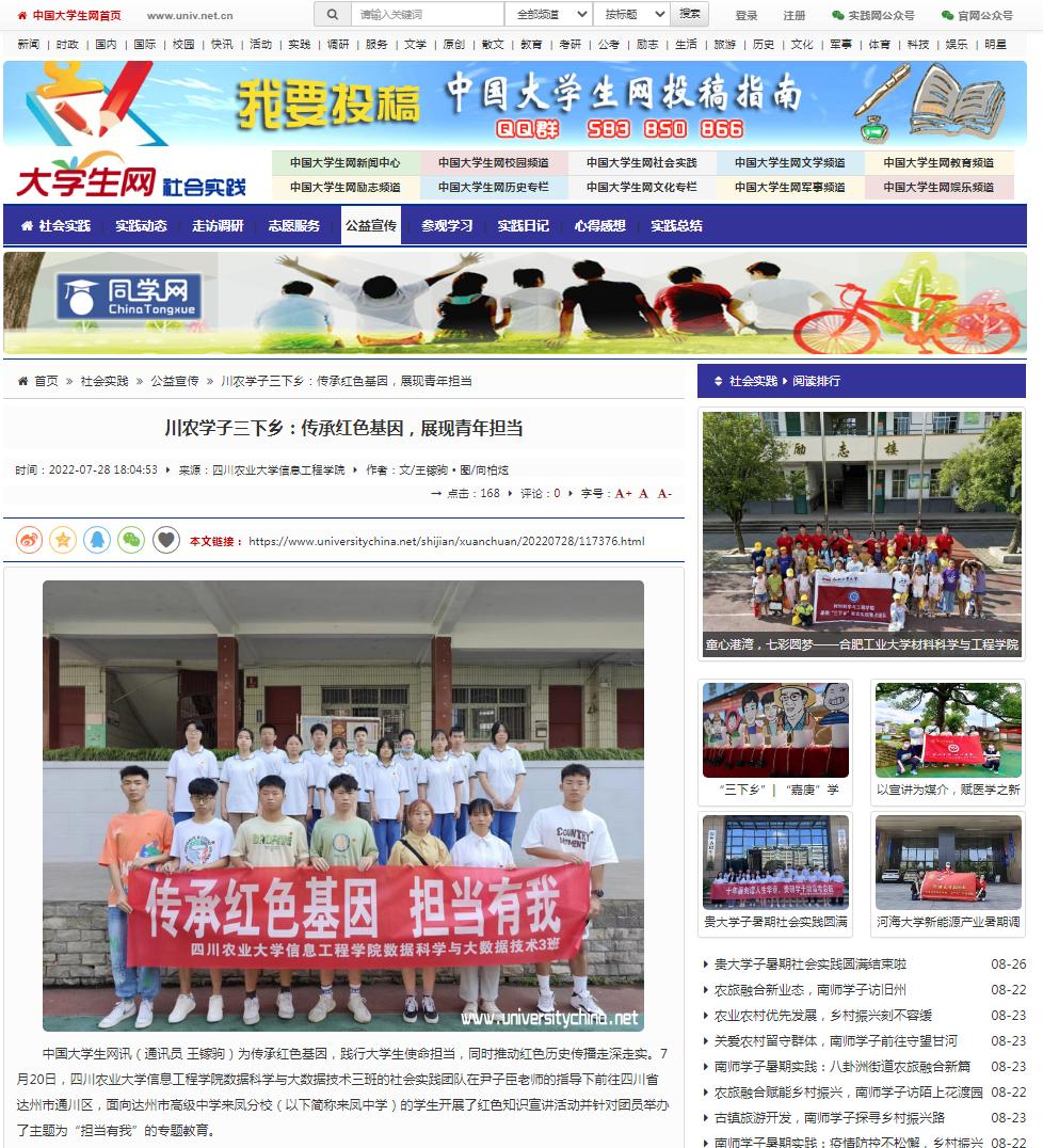 中国大学生网讯(通讯员 王镓驹)为传承红色基因,践行大学生使命担当,同时推动红色历史传播走深走实。7月20日,必赢565net官网数据科学与大数据技术三班的社会实践团队在尹子臣老师的指导下前往四川省达州市通川区,面向达州市高级中学来凤分校(以下简称来凤中学)的学生开展了红色知识宣讲活动并针对团员举办了主题为“担当有我”的专题教育。