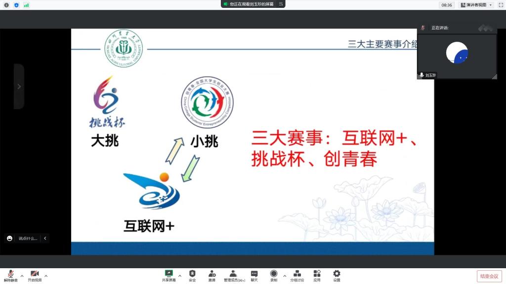 会上,刘玉珍为同学们讲解了挑战杯、创青春——“小挑”、“互联网+”三大竞赛项目作品类别、参赛组别、参赛时间、奖项设置等重要内容,鼓励同学们积极参加比赛。另外,她还详细介绍“互联网+”赛道区别,目前参赛形势、预选赛院赛校赛改革内容,确保大家充分了解相关政策。随后,董健向同学们展示了三大竞赛项目的答辩视频,江鸿波为同学们分享参赛经验,他以自身为例,从确定方向、技术学习、技术深入、项目拟定到项目发展详细介绍了参赛的全过程,鼓励同学们摆脱“依赖性学习”,勇于实践应用。