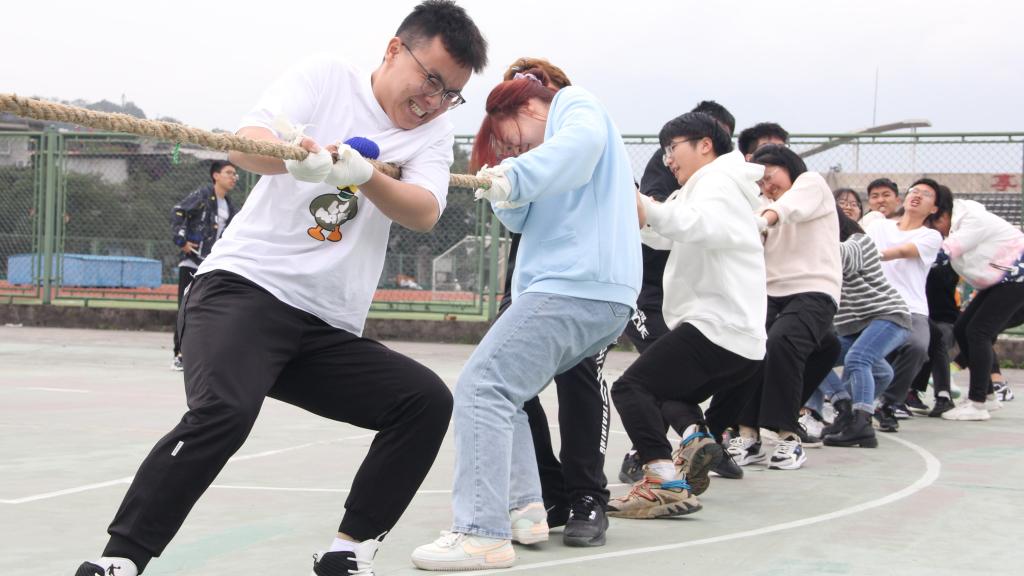 参赛队伍以班级为单位,每班派出10名男生,6名女生以及2名替补。通过抽签的形式将13个小班以3,3,3,4的形式分为4个小组,进行循环积分赛。首日比赛,选手们口中一起高呼着“一二,一二”的口号,绑着绷带的双手紧握长绳,攒足了劲向后拉。未参赛的学生组成啦啦队为本班选手欢呼打气,热烈的加油声鼓舞了拔河队员们的士气,也让比赛现场气氛更加热烈。