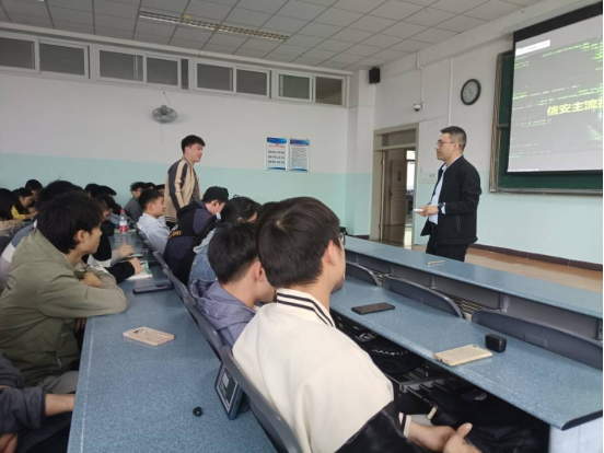 讲座开展过程中,杨正辉工程师就“数字化产业升级带来的人才需求变化如何破局”,“常见的IT岗位及发展”和“大学生宽口径就业出口”等方面进行了详细的分析讲解并对应届大学生提出了相应的建议。同时,杨正辉工程师对新兴行业“网络安全技术”做了进一步的普及。活动现场,气氛活跃,主讲人慷慨激昂,同学们积极回应,并不时记录笔记。