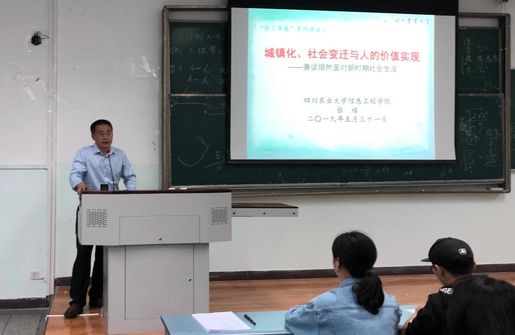 在近来学校生命安全问题事件突发的背景下,为了调整学院同学们的心态,乐观积极面对学习及生活中遇到的困难,树立积极的人生态度,养成良好的思维方式,5月31日下午4:30,必赢565net官网第十三期“信工青春”系列思政教育主题讲座在育新楼A401顺利开展。本次讲座以“城镇化、社会变迁与人的价值实现——坦然面对新时期社会生活”为主题,特邀学院党委书记张禧教授担任主讲人。学院17、18级各小班全体和团委学生会全体主干到场聆听。