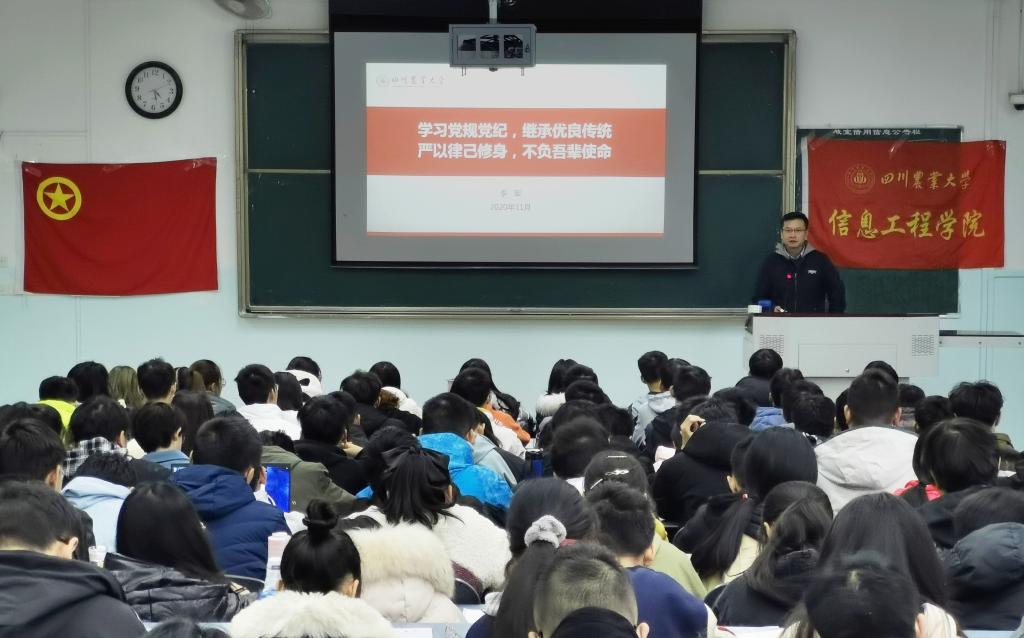 李军副院长从大学生学习党规党纪的意义,以及个人与中国共产党的关系出发,强调廉洁、律己、修身对大学生成长成才的重要意义。他回顾党的发展历程详细阐述党的纪律内涵,对党的纪律建设和优良传统作风进行了重点讲解,循序渐进地将党规党纪融入到青年团员的思想教育中,引导青年团员树立守纪律、讲规矩的意识和观念。他希望信工学子能不断提高自身规矩意识、纪律意识、责任意识,做到廉洁律己修身,积极作为,做党和国家建设发展的铺路人。