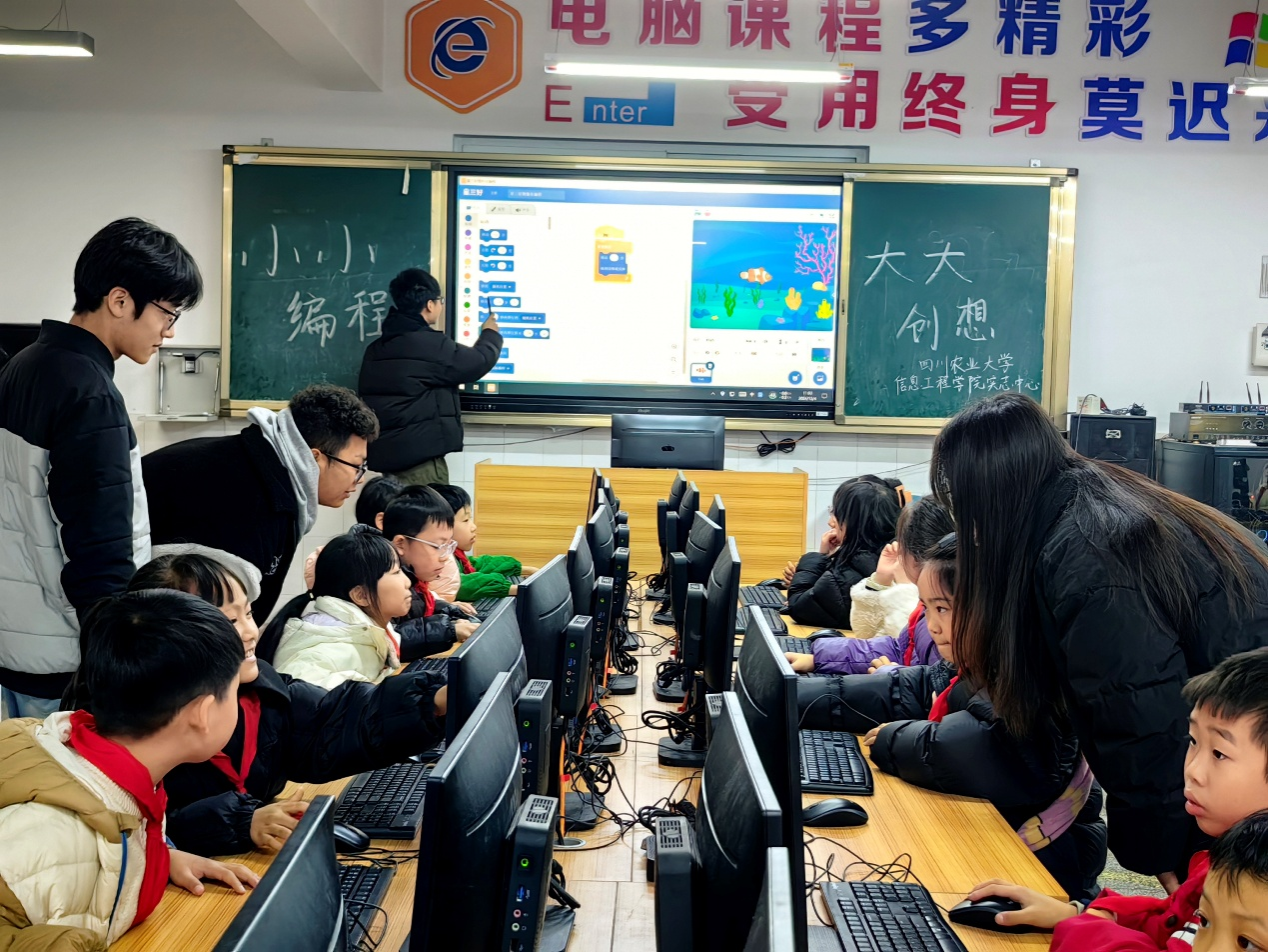 教学活动中,志愿者们对如何使用编程软件以及一些基础模块进行耐心讲解。随后便带领小朋友们使用编程软件制作精彩的水族馆动画,将所学习的编程知识即刻应用于实践中。在听课的过程中,同学们端坐在凳子上,认真看着眼前的新鲜事物,展现出强烈的好奇心。