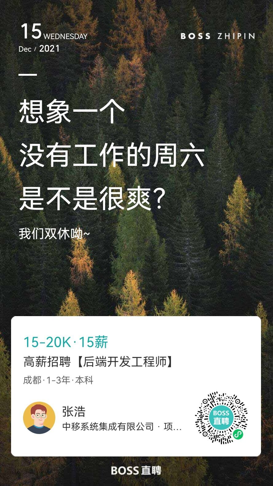 招聘前后端开发工程师和产品经理,公司为中国移动,属正式编制,工作地点天府五街,月薪15-20K,年终奖一般3-4个月工资,六险二金。要求如下: